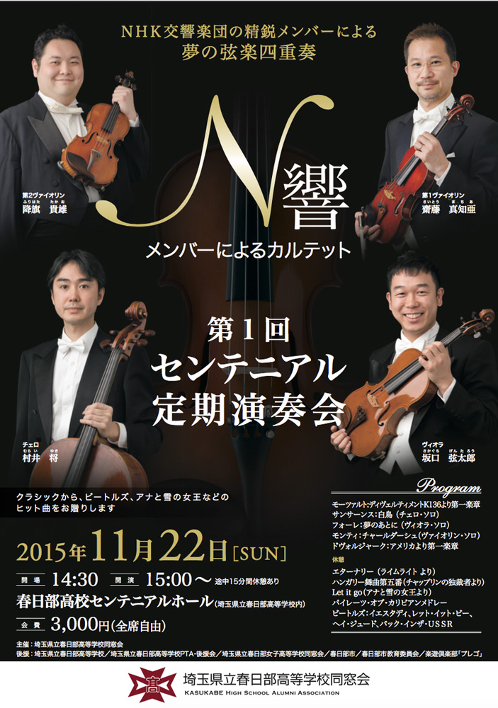 春日部高校同窓会では、音楽ホールを活用した「春高文化の森」事業を推進しておりますが、音楽ホールの完成を記念して開演した「センテニアルオペラ」は、今年4月の公演で既に18回目を迎えました。また、毎年1月に行われるPTA主催の「ニューイヤーコンサート」も重要な文化行事として定着しております。これらに加え、今年から新たに、N響精鋭メンバーによるセンテニアル定期演奏会を行うことになりました。お誘い合わせの上、お申込みくださいますようご案内申し上げます。