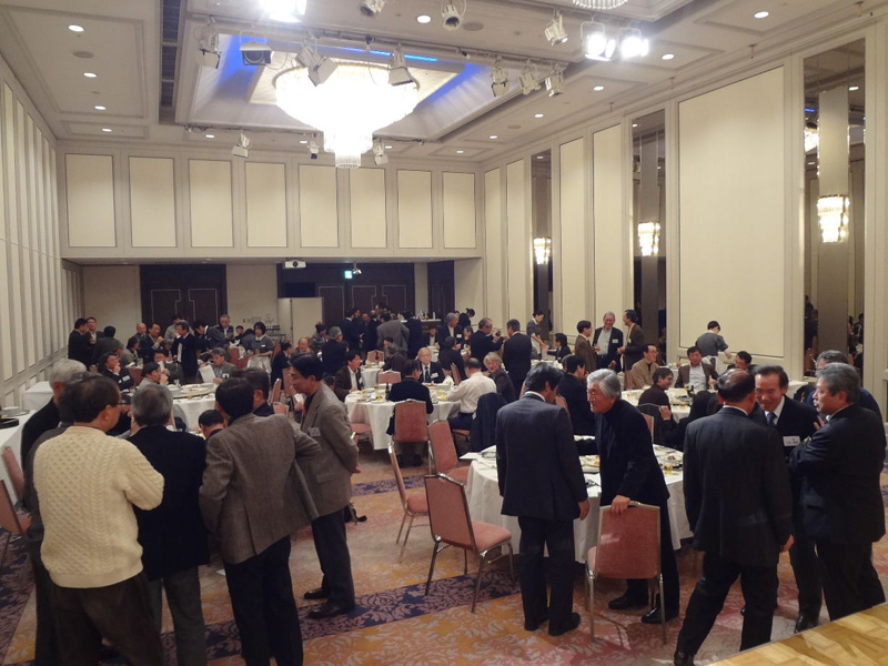 しばらく歓談が続きました。写真にあるように、参加者96名、会場狭しと話の輪が広がり、和やかな笑顔や笑いの渦が、あちこちにありました。頃合いを見計らい、住友グループの大浜君が、各テーブルに廻り、突撃インタビューを敢行、それぞれの思い出等のお話を聞けました。