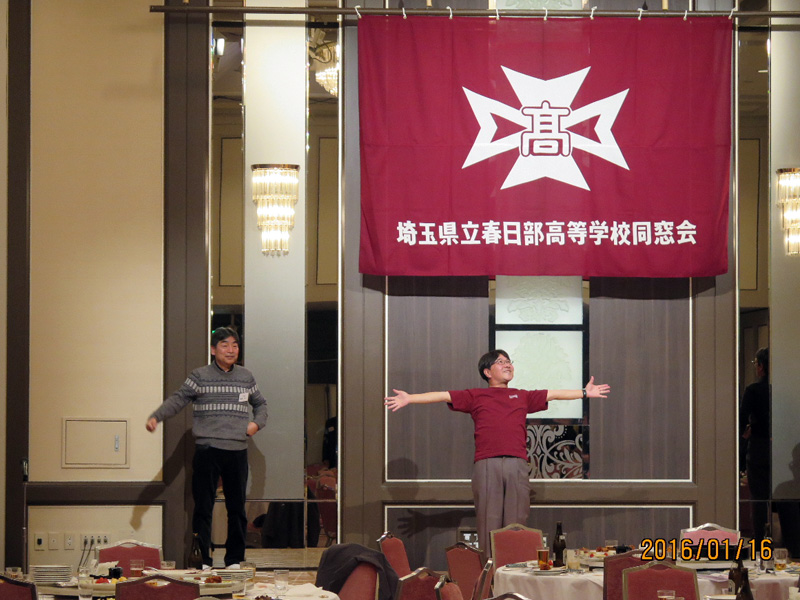 頃合いを見計らい、恒例の校歌斉唱とフレーフレー春高のエール。応援指導部だった安島君のリードです。安島君は春高カラー、エンジのTシャツに着替え登場。彼のリードは今でも声に張りがあり、会場内いっぱいに轟き渡りました。安島君、君は今でも若い!! 会場の雰囲気は最高潮。春高の校歌の素晴らしさと私たち同窓生の連帯感に酔いしれました。