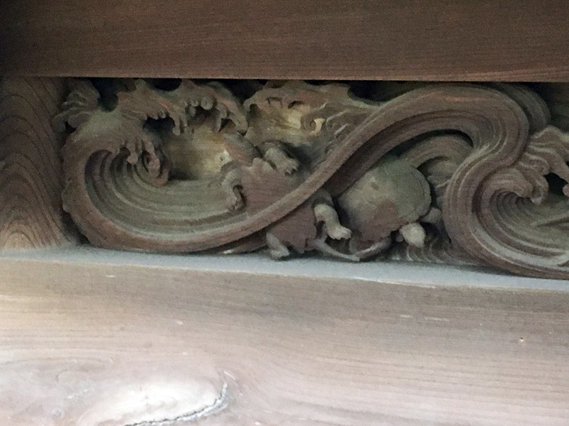 題経寺では、帝釈堂内陣の外側にある仏教説話の彫刻が見もの。なんでも、現代の名工に1億円出すので同じものを彫ってほしいと依頼したところ断られたとか。写真は、作者のいたずら心?で彫られたという亀のみ掲載。興味の沸いた方は是非ご自分の目で。
