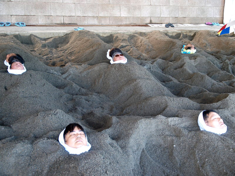 次に向かったのは、砂蒸し温泉「砂楽」サウナをイメージしていて一同5分も入れれば上出来と思っていたところ、かなりのメンバーが30分も埋まっていたのです(浴衣一丁だったこともあり、気持ち良くて寝付いてしまった模様)。