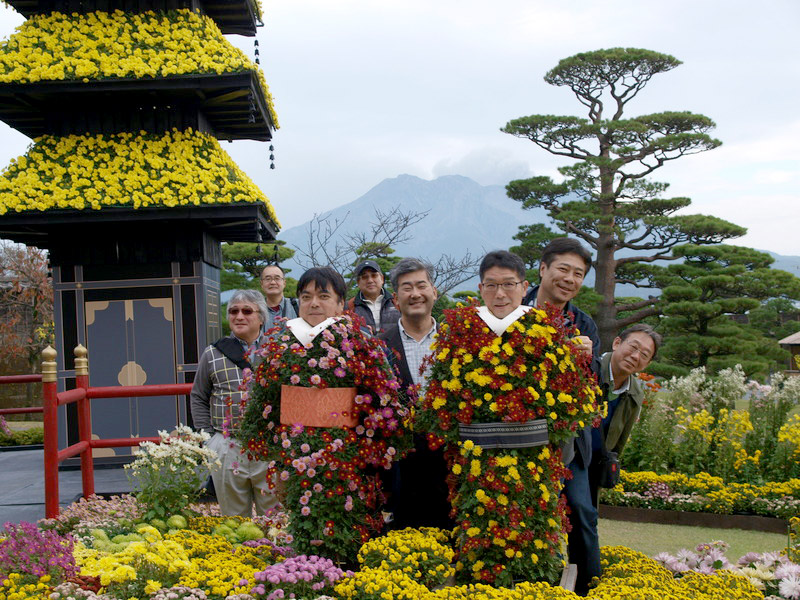 そしてもう一度シティービューバスにて移動(この時は運転手が名所を説明、途中に西南戦争の弾丸跡が残ったままの壁は迫力もの)した鹿児島滞在最後の地は「仙厳園」。世界遺産も含んだ島津家ゆかりの場所。菊人形など菊をあしらったものも展示され華やかさもありました。そして、最後の最後に訪れたこの場所で、キリや雲もなく、くっきりと雄大な姿の桜島が現れてくれました(まるで我々との別れを惜しむよう)。