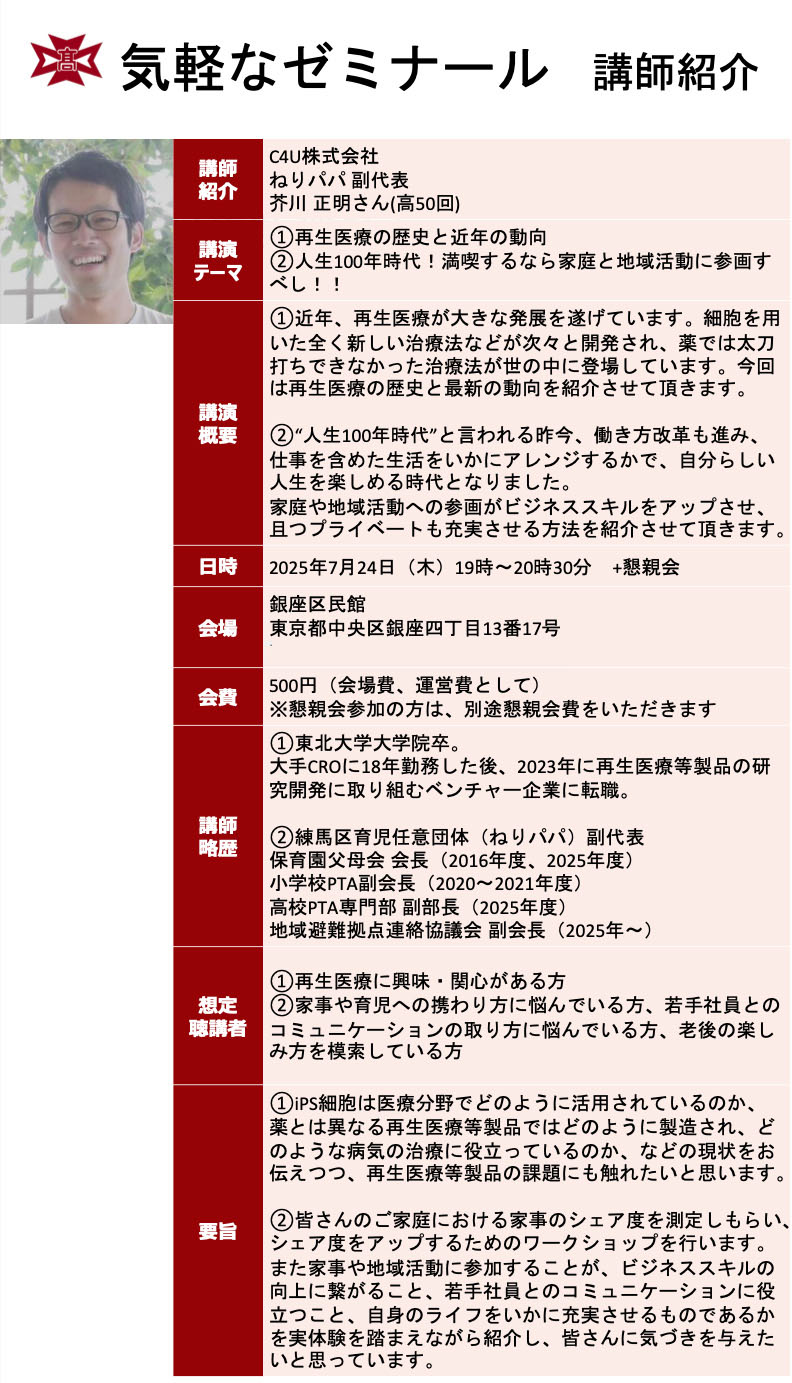 今回の気軽なゼミナールは、C4U株式会社/ねりパパ副代表の芥川 正明さん(高50回)に