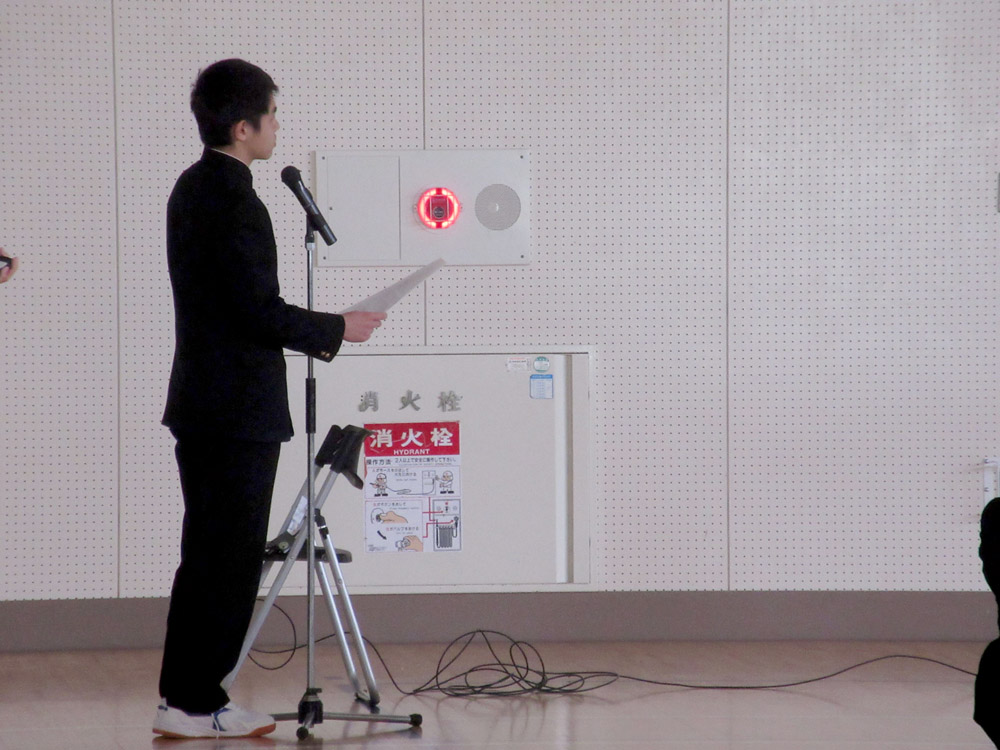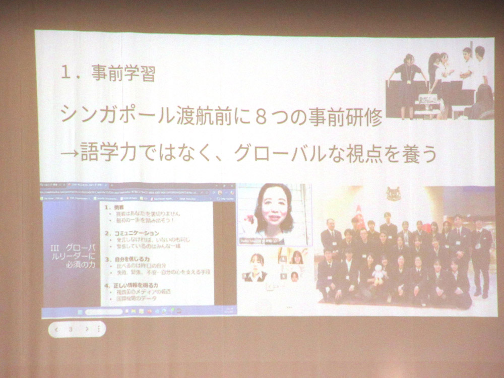 校長の挨拶後には、グローバルリーダー育成プロジェクト(県教委主催)に選ばれ、シンガポールで短期研修を行った奥田啓太君から、全校生徒に向け報告が行われた。